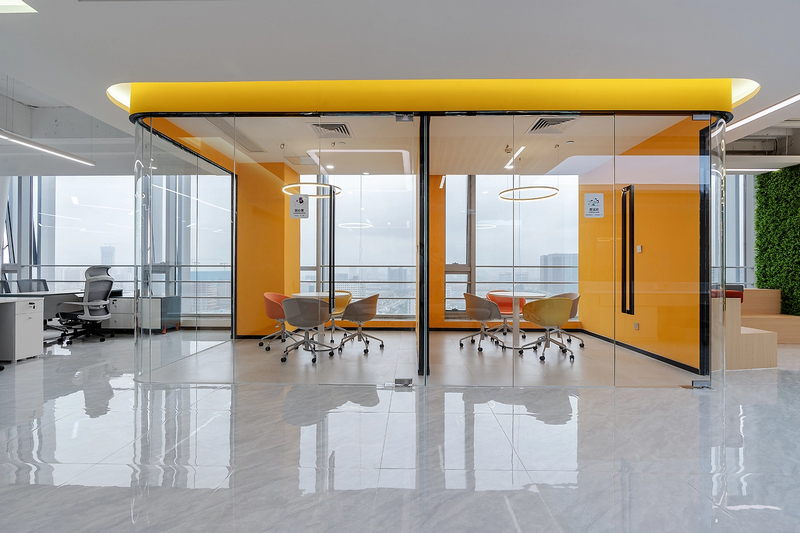 玻璃隔斷: 通透性好,采光佳,可以保持空間的通透感,適合用于需要采光和隔音的區域。